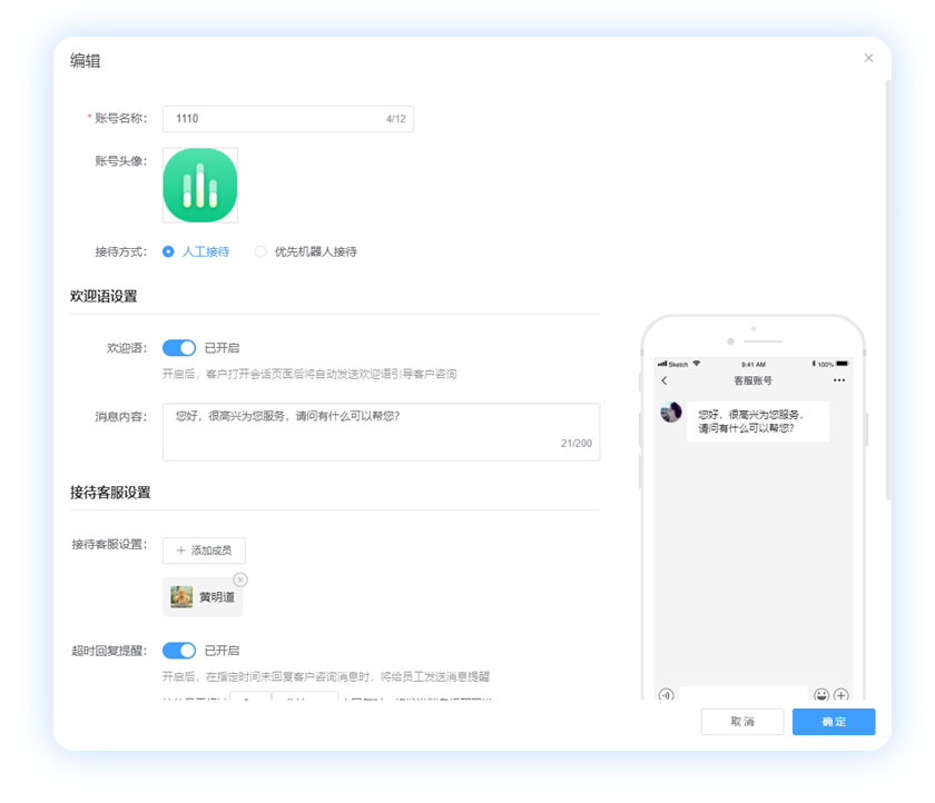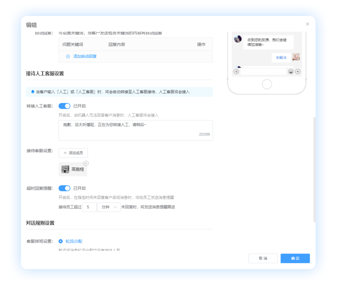 中大型企业及其他客户咨询量大的企业可设置优先机器人接待,机器人客服会依据后台设置的关键词进行智能匹配回复,减少人工客服工作量,降低客户等待时长。客户没有得到想要的答案时,还可以通过呼叫人工自动切换到人工客服,方便灵活。人工客服可设置自定义换迎语、指定接待员工,超时回复提醒功能,避免因客服忙线造成客户等待。